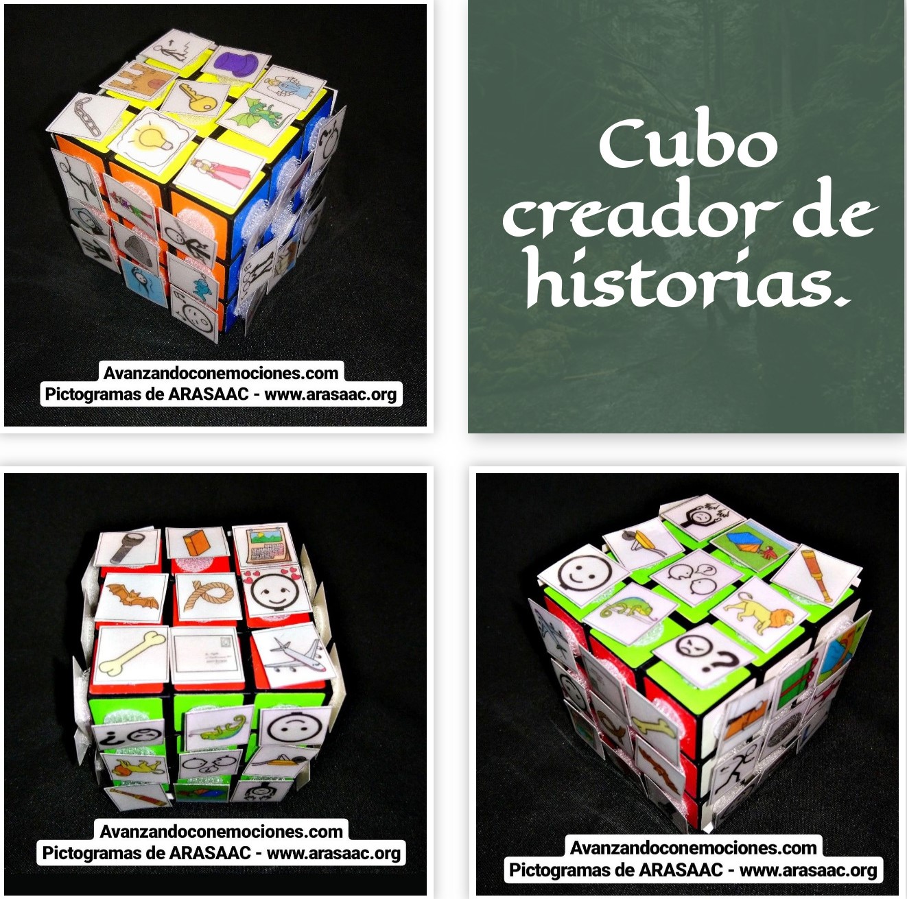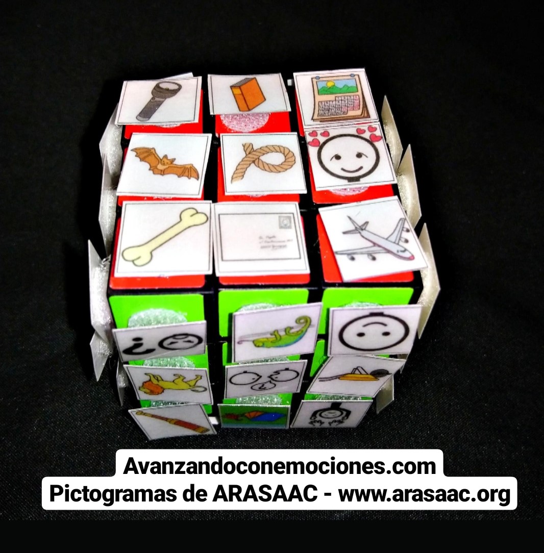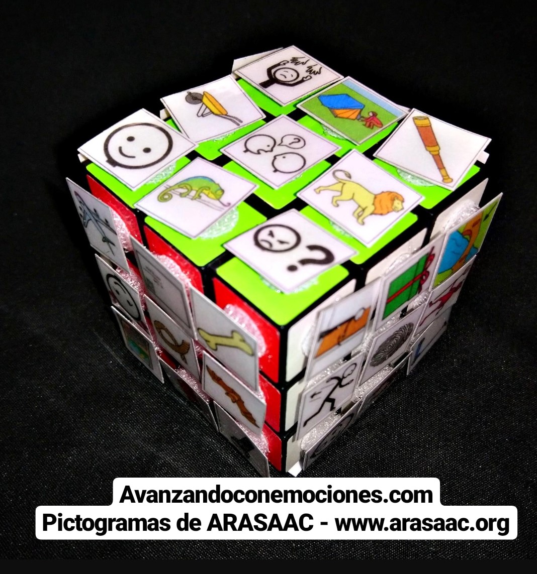 La idea más conocida es mover el cubo de rubik con los pictos puestos al azar y los ojos cerrados. Una vez pares el movimiento eliges una cara y comienzas a crear tu propia historia basándote en los pictogramas que han salido. (Pictogramas extraídos de ARASAAC – www.arasaac.org)