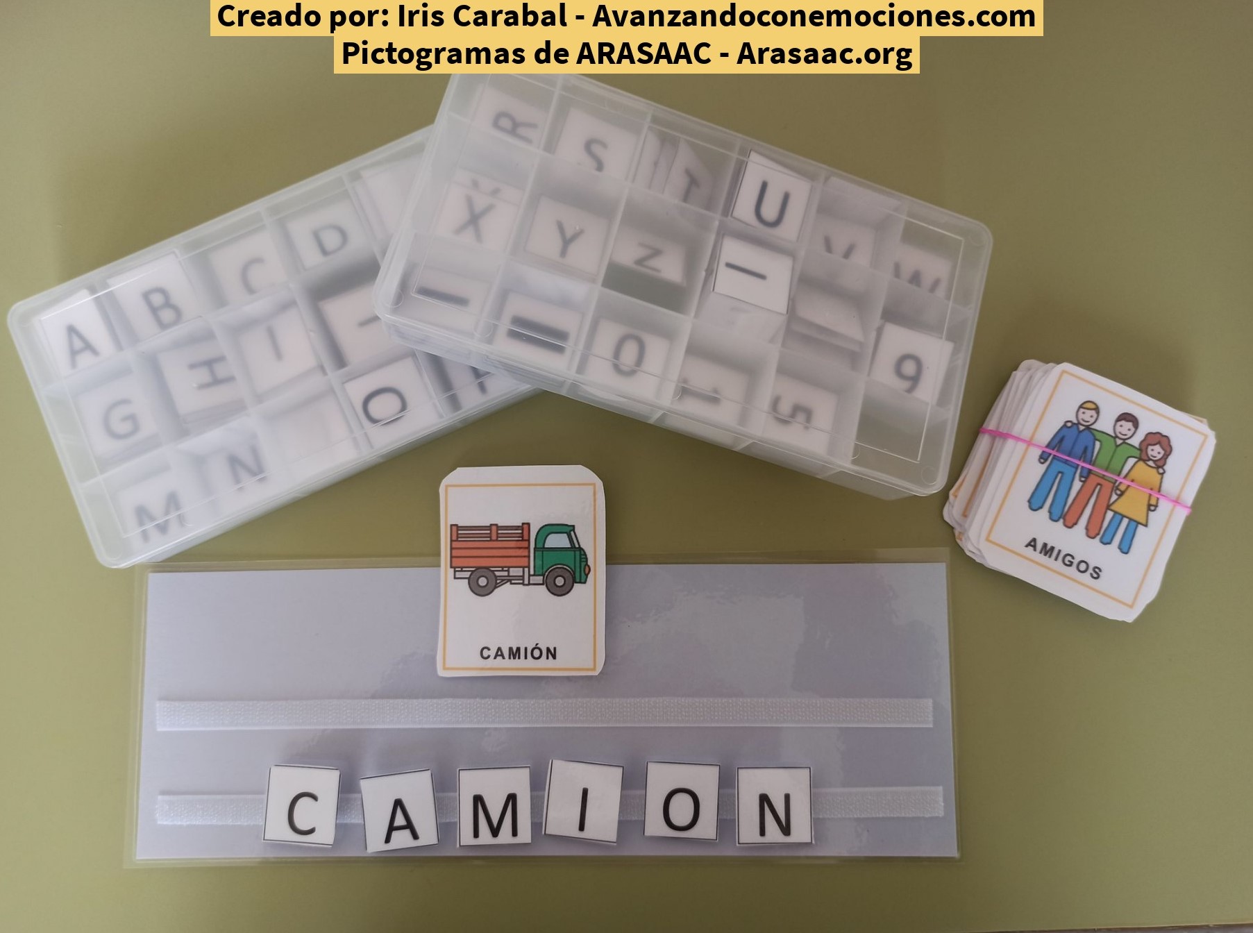 Para crear tu propio tira-letras únicamente tienes que plastificar una tira de cartulina y añadirle velcro. Puedes hacerlo de diversas formas para incluir (o no) el apoyo visual del pictograma con la palabra escrita. Todo depende de las dinámicas con las que trabajes y la necesidad o apoyo que requiera tu alumnado.